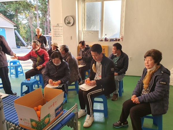 완숙과를 골라서 구분 수확해 출하하기 시작하면 된다. 한 상자 안에 담긴 감귤 당도가 들쭉날쭉하면 제값을 받기 어렵다. 예를 들어 한 상자에 감귤 당도가 11브릭스, 12브릭스, 13브릭스로 제각각이라면 11브릭스 감귤 가격을 받게 된다. 13브릭스만 골라서 출하하면 더 높은 가격을 받을 수 있는데 그렇지 않으면 제값 받기가 어렵다. 강의=강만희 농가. 정리=윤주형 기자