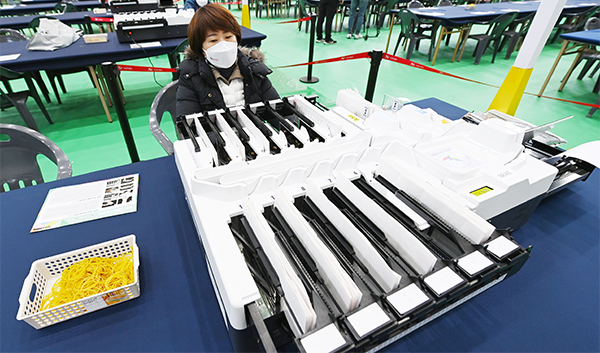 제20대 대통령선거가 9일 치러지는 가운데 전날인 8일 사라봉다목적체육관에 제주시선거관리위원회개표소가 설치된 가운데 선거요원들이 개표시스템을 최정 점검하고 있다. 김용현 기자