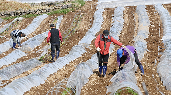 지난 25일 제주지역에 태풍급 강풍이 불면서 생채기를 남긴 가운데 평온한 날씨를 되찾은 27일 제주시 애월읍 농촌에서는 농민들이 강한바람에 파손된 비닐멀칭을 보수하는 작업을 하느라 분주하다. 김용현 기자