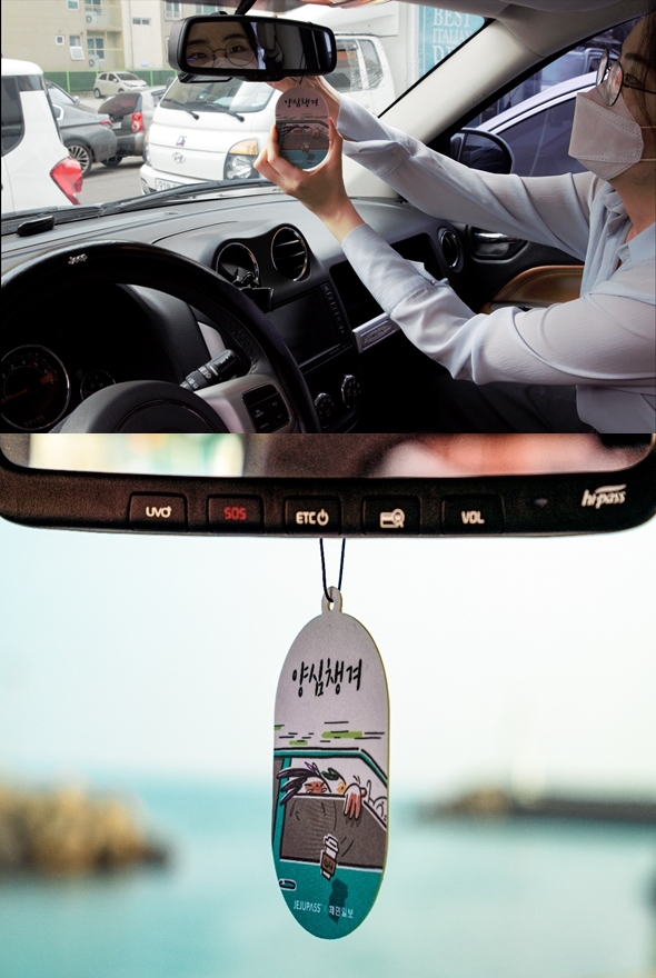 ‘나 하나인데 어때’ ‘이번 한 번인데 어때’하는 사소한 부주의에 경종을 울리는 종이 방향제가 전면에 나선다. 친환경 소재를 활용해 제작한 방향제 앞 면에는 '양심챙겨'라는 메시지와 함께 차창 밖으로 몰래 쓰레기를 버리는 모습을 표현한 일러스트를 담아 한 번 더 생각할 기회를 준다. 뒷면 QR을 스캔하면 제주패스의 멤버십 'MJB 멤버스'로 연결되며, 가입 때 제주도내 200여개 카페에서 사용 가능한 무료 커피 이용권을 받을 수 있다.