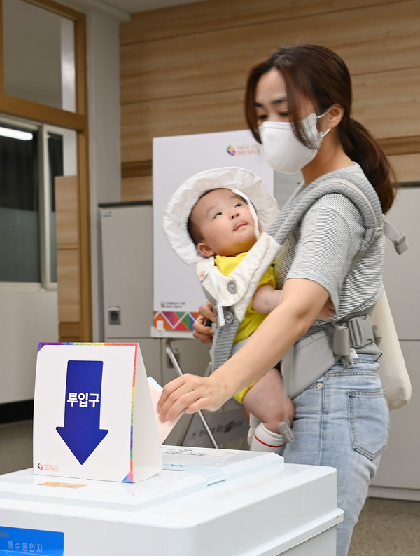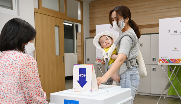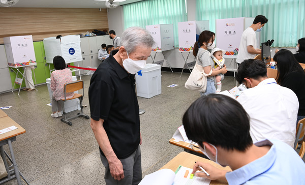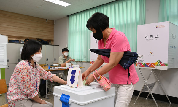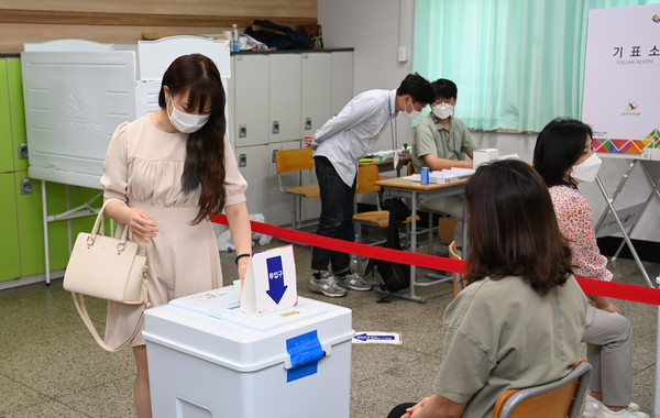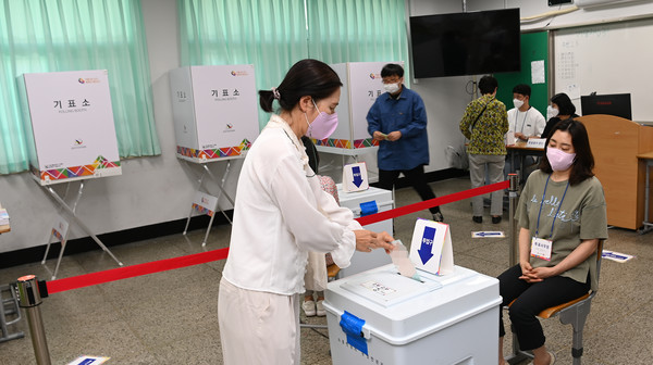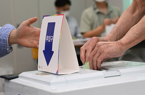 제8회 전국동시지방선거 및 국회의원 보궐선거일인 1일 제주시 남녕고등학교에 마련된 연동 6투표소에는 유권자들이 소중한 한표를 행사하고 있다. 김용현 기자