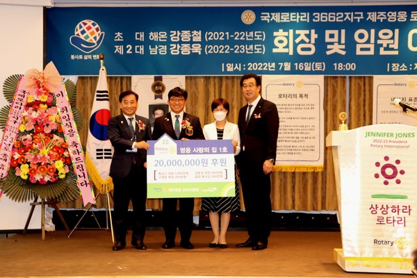 국제로타리3662지구 제주영웅로타리클럽(회장 강종욱)은 지난 16일 메종 글래드 제주에서 제2대 회장 이·취임식을 기념해 초록우산 어린이재단 제주지역본부(본부장 박정숙)에 취약아동 주거환경 개선사업(영웅 사랑의 집)을 위한 성금 2000만원을 후원했다.