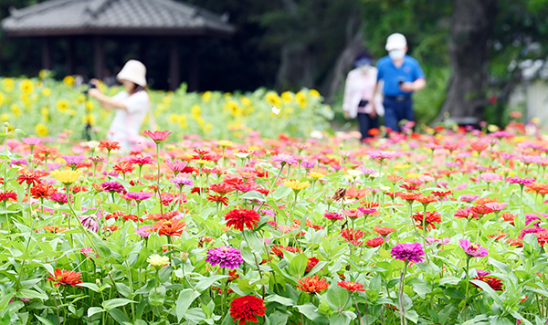 다소 흐리고 무더운 날씨를 보인 24일 제주시 애월읍 고성리 항몽유적지 인근에 형형색색의 백일홍꽃이 만개해 도민과 관광객들의 사진찍기 삼매경에 빠졌다. 김용현 기자
