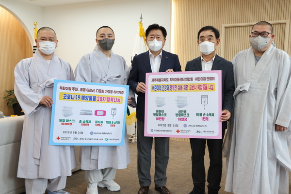 ㈔나누며하나되기(총재 무원스님·천태종 총무원장)는 지난 24일 제주도청에서 도내 취약계층을 위한 덴탈마스크 25만장과 손소독제 2만1000개 등 3500만원 상당의 코로나19 방역물품을 기탁했다.