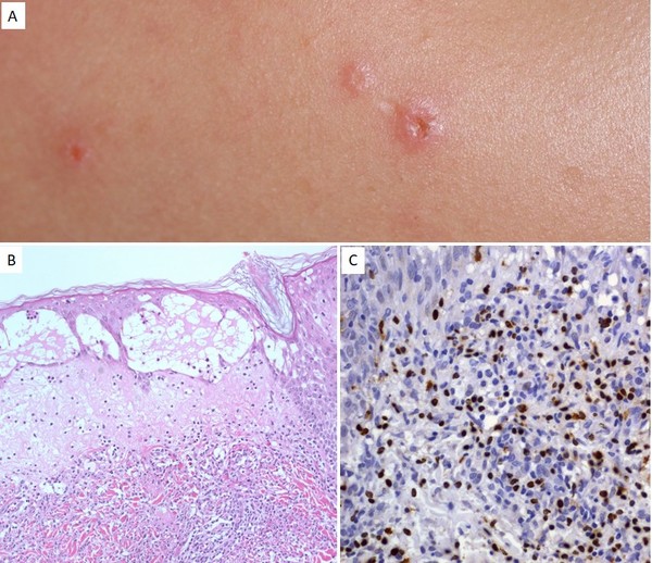 환자는 피부과에서 피부 생검을 하였고 병리 검사에서 이 질환에 진단적인 피부 변화를 확인하고 시행한 특수검사에서 엡스타인바 바이러스가 다수 검출돼 종두상 수포증 림프 증식 질환으로 확진됐다.