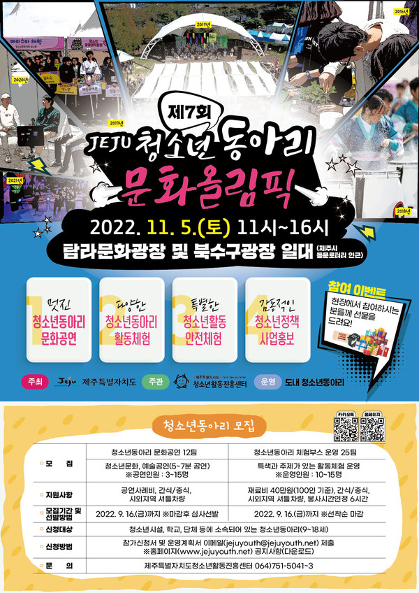 요즘 지척에서 축제 2~3개가 동시에 진행되고 있을 정도로 어딜가나 축제를 볼 수 있다. 11월 5일 토요일에는 제주최대 청소년축제인 제주청소년동아리문화올림픽이 11시부터 16시까지 탐라문화광장 및 북수구 광장에서 열린다.