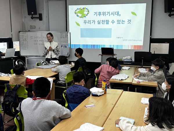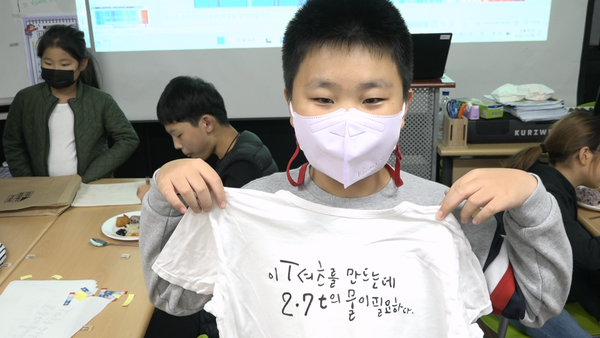 학생들은 각자 준비해 온 '덜 입는 옷'에 친환경 실천과 관련한 문구를 담는 리사이클링 작업을 하며 "오늘 배운 것을 잘 지키고 주변에도 알리겠다"고 말했다.