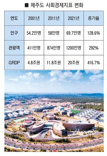 인구·관광객 증가와 산업 고도화에 힘입어 제주 지역내총생산(GRDP)은 2001년 4조8000억원에서 2011년 11조8000억원, 지난해 20조원으로 10년마다 2배씩 성장해 20년간 416.7% 성장했다. 1인당 GRDP는 2019년 3080만원으로 2010년(2040만원)보다 1040만원(51.2%) 증가했다.