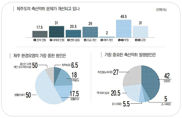 '개선되지 않고 있다면 그 책임은 어디에 있는가'라는 설문에 '축산농가의 관리 부실'이 44.3%로 가장 높았다. 이어 '제주도의 단속 부재'가 26.8%, '행정당국의 지원 부족'이 23.7%로 조사됐다.