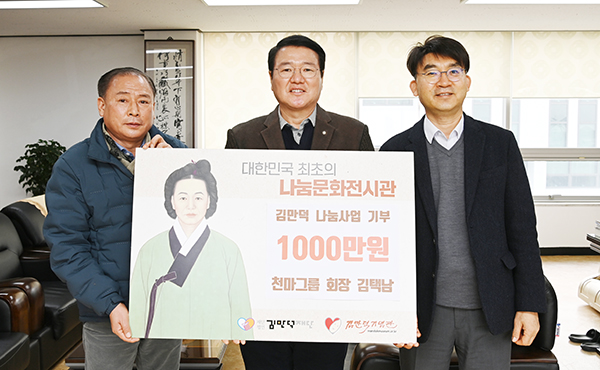 김택남 천마 회장은 지난달 28일 김만덕기념관(관장 강영진)에 '사랑의 쌀' 성금으로 1000만원을 기탁했다.