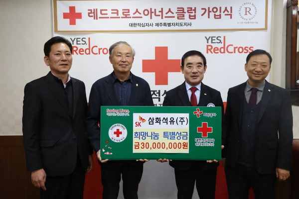 삼화석유㈜(대표이사 홍성준)는 최근 대한적십자사제주도지사(회장 오홍식)를 방문해 지역사회 소외된 이웃을 돕는데 써달라며 희망나눔 특별성금 3000만원을 전달했다.