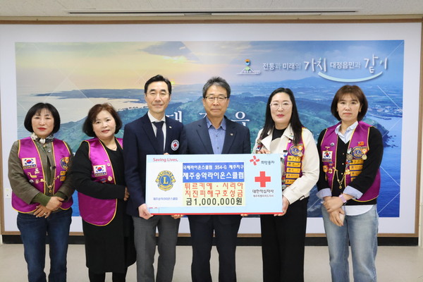 제주송악라이온스클럽(회장 라혜경)은 최근 서귀포시 대정읍 소회의실에서 대한적십자사제주도지사(회장 정태근)에 튀르키예·시리아 지진피해 긴급구호 성금 100만원을 기탁했다.