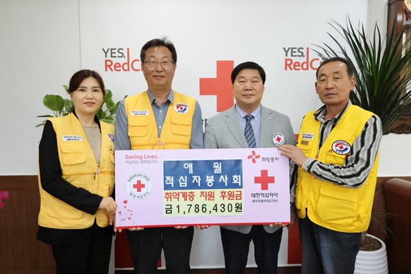 애월적십자봉사회(회장 이승헌)는 최근 대한적십자사제주특별자치도지사(회장 정태근)를 방문해 지역사회 취약계층 지원을 위한 후원금 178만6430원을 기탁했다.