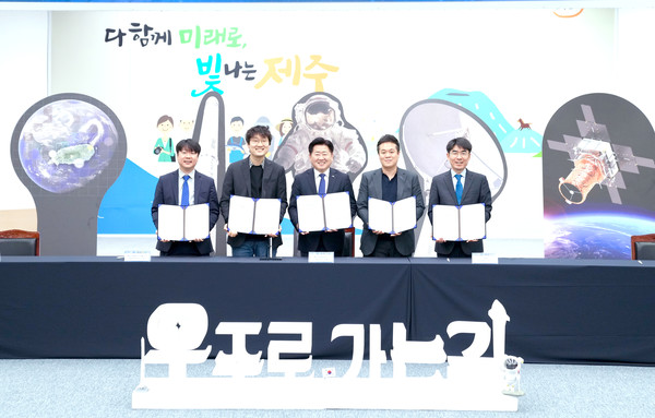 済州道は8日、済州道庁ホールで「済州スペースデー」を開き、済州で活動するグローバル先導宇宙企業であるフェリージエアロスペース、アイオプス、SIIS、コンテック4社と宇宙産業育成および革新拠点造成のための業務協力協約を締結した。