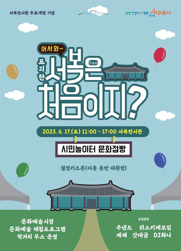 서귀포시는 오는 17일 서복전시관 무료개방을 기념해 시민·관광객이 문화를 주제로 교류하는 '시민놀이터 문화점빵'을 서복전시관에서 개최한다.