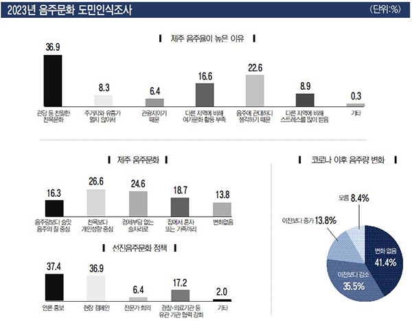 '제주지역 음주율이 높은 이유가 무엇인가'라는 질문에 '괸당 등 친밀한 친목문화'가 36.9%로 가장 높았다. 이어 '음주에 관대하다 생각하기 때문'은 22.6%, '다른 지역에 비해 여가문화 활동이 부족해서'는 16.6%, '다른 지역에 비해 스트레스를 많이 받아서'는 8.9%, '주거지와 유흥가 멀지 않아서' 8.36%, '관광지이기 때문' 6.4% 등 순으로 나타났다.