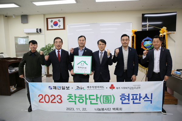 지난 22일 탐라자동자운전전문학원 강의실에서 제33호 착하단 현판식과 함께 나눔봉사단 백록회 문성보 회장과 고윤혁 내무부회장, 문형철 총무이사, 오홍식 제민일보 대표이사, 강지언 제주사회복지공동모금회장이 참석한 간담회가 열렸다.