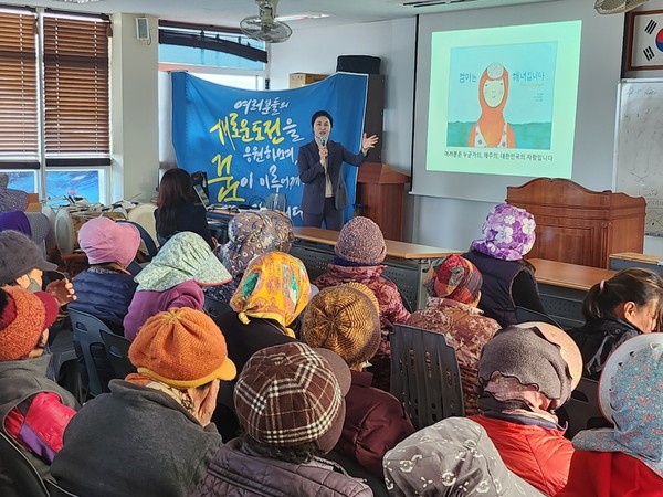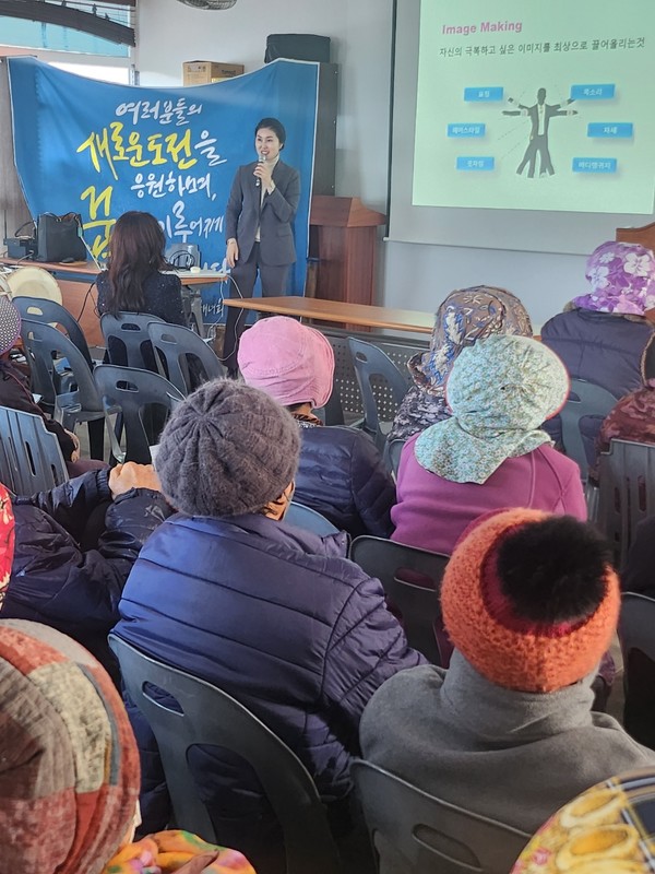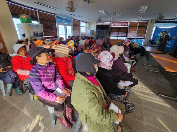 제민일보는 사단법인 세계문화유산보존사업회·제주특별자치도와 함께 '2023 해녀를 말하다' 인문학 강좌의 여덟 번째 강연을 지난 11월 28일 귀덕2리어촌계 소속 해녀를 대상으로 진행했다. 이날 강연은 임한나 이미지메이킹 컬러리스트가 강사로 나서 '이미지 메이킹'을 주제로 강연했다.