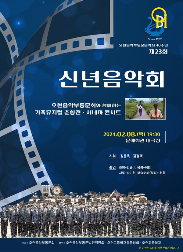 장경덕 회장은 "이번 음악회는 새로운 도전과 변화를 시도하기 위해 우리는 뮤지컬과 시네마 콘서트를 준비했다"며 "오현음악부동문회가 만들어내는 따뜻한 하모니로 관객들에게 추억으로 남기를 기대한다"고 말했다. 선착순으로 입장 가능하며 관람료는 무료다.
