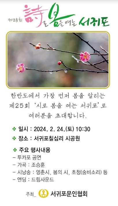 (사)한국문인협회 서귀포지부(지부장 정영자)는 오는 24일 서귀포칠십리시공원에서 제25회 '시로 봄을 여는 서귀포' 행사를 개최한다.