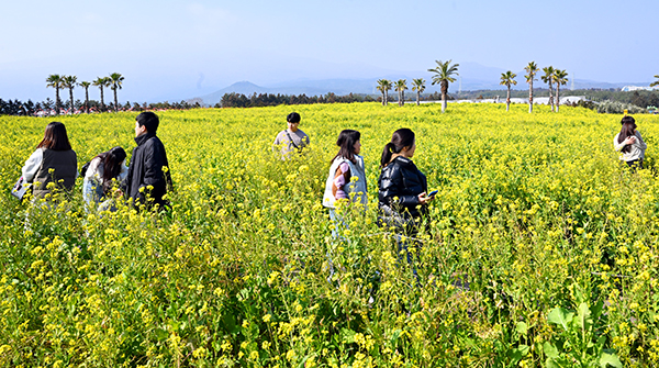 올해 설명절 연휴 마지막날인 12일 맑고 포근한 날씨를 보인 가운데 서귀포시 남원읍 휴애리 자연생활공원에 노란색 유채꽃이 활짝 펴 이곳을 방문한 도민과 관광객들이 제주여행을 만끽하고 있다. 김용현 기자