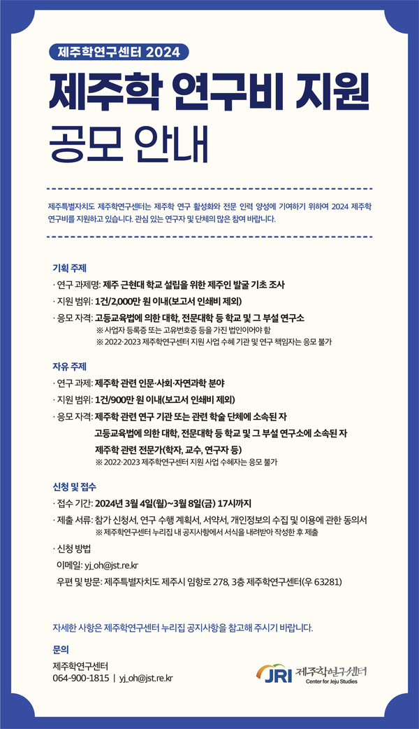제주특별자치도 제주학연구센터(센터장 김순자)가 2024년 제주학 총서 출판비와 연구비 지원과 관련, 공모를 진행한다.