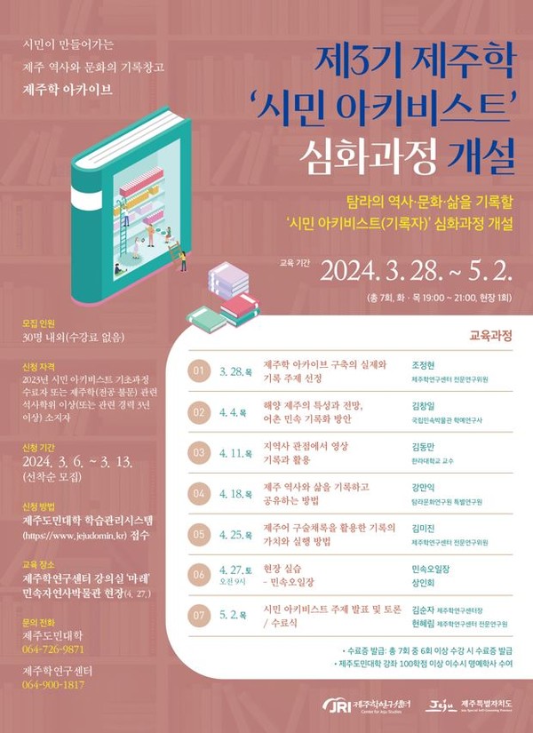 심화과정 강좌는 3월 28일부터 5월 2일까지 매주 목요일 오후 7~9시(총 7회, 현장 실습은 4월 27일 토요일/민속오일장) 제주학연구센터 강의실 '마레'에서 열린다. 심과과정 신청자격은 2023년 제주학 시민 아키비스트 기초과정 수료자와 제주학 관련(전공 불문) 석사학위 이상(또는 관련 경력 3년 이상) 소지자이다.
