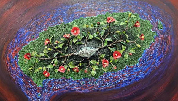 그의 대표작 '시간이 흘러도'는 오 작가의 증조할머니와 외할아버지가 4·3때 희생당한 사건을 그린 작품으로 동백나무를 통해 당시의 상흔을 표현했다.