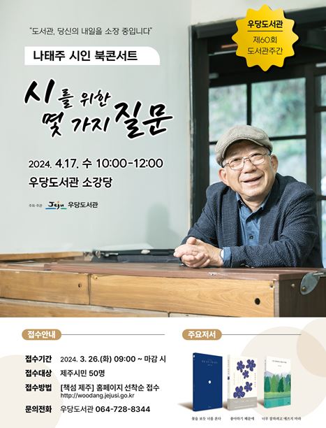 제 60회 도서관 주관을 맞아 열리는 이번 북콘서트에서는 '시를 위한 몇 가지 질문'을 주제로 시를 통해 헤아리는 삶의 지혜를 참여자들과 함께 나눌 예정이다.