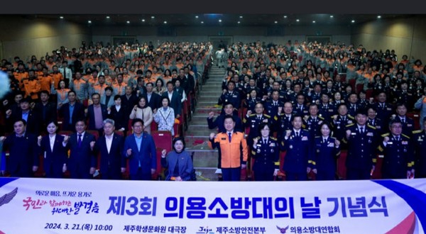 제주도소방안전본부 (본부장 고민자)는 최근 제주학생문화원 대극장에서 '의로운 마음, 뜨거운 용기로 국민과 함께 위대한 발걸음'을 주제로 제 3회 의용소방대의 날 기념식을 개최했다.