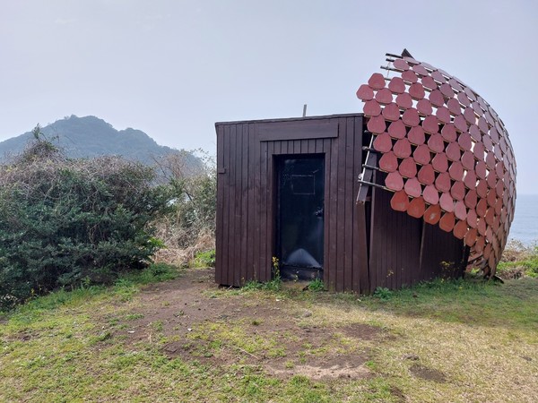 이 조형물은 송산동에서 설치하였다. (섶섬지기카페도 송산동 소유로 보목마을에 위탁 운영하고 있다.) 송산동 섶섬지기 관리담당공무원에게 조형물이 파손된체로 방치된 이유를 물어 보았다. 담당 공무원은 오래전부터 파손된 것을 알고 있었으나, 담당 공무원이 자주 바뀌고 예산도 없고, 설치된 그 동산도 민간소유 땅이다보니 지금까지 미루어 졌으나, 빨리 예산을 확보해서 보수나 철거를 하겠다고 말했다. 이 멋지고 아름다운 동산(전망대)에 무슨 조형물이 더 필요한가? 낡아 허물어진 초소와 조형물을 깨끗이 치우고, 조망을 가리는 나무들도 정비하여, 보다 쾌척하고 아름다운 쉼터가 되도록 조성하기 바란다.