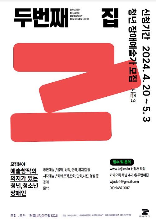 커뮤니티아트랩KOJI(대표 민경언)는 청년장애예술가 인큐베이팅 교육과 배우 훈련 과정인 '장애예술가랩-두번째집'에 참여할 장애인창작자(예비장애예술인, 장애인배우)를 다음달 3일까지 모집한다.