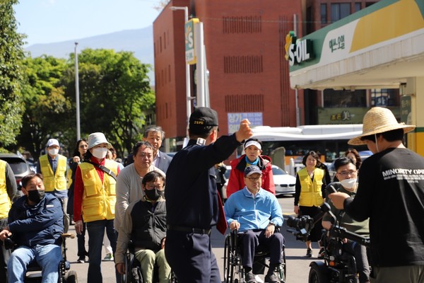 2부에서는 휠체어를 탄 장애인들과 함께 제주시내 거리를 이동하면서 장애인 이동권 확보를 위한 개선방안 등을 논의했다.