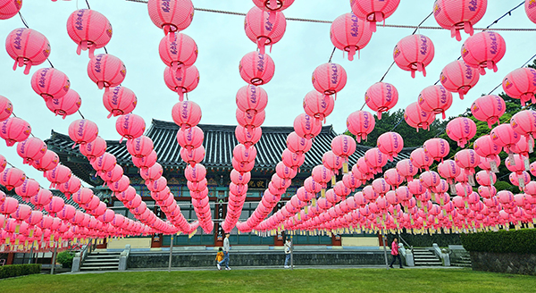 불기 2568년 부처님 오신 날(5월15일)이 이틀 앞으로 다가온 가운데 애월읍 극락사에는 분홍색 연등이 설치돼 석가모니의 탄생을 축하하고 있다. 부처님오신날 법요식은 15일 오전 대한불교조계종 제23교구 본사인 제주시 한라산 관음사에서 봉행된다. 김용현 기자