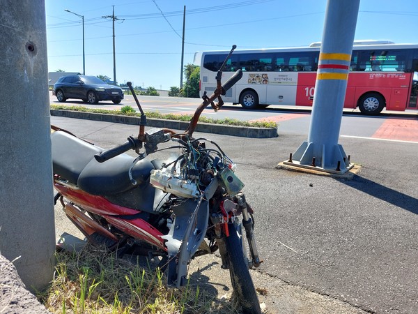 그런데, 세계적인 관광지인 제주도 일주동로 소금밭 교차로(남원읍 태흥리 태흥주유소 맞은 편) 대로변에, 교통사고로 부서진 오토바이가 6개월 이상 방치상태에 있다. 차체는 부서지고 녹이 심하게 슬어 건드리면 조각이 날 정도이다.