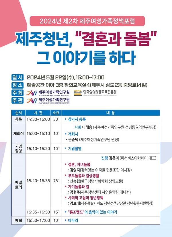 제주여성가족연구원(원장 문순덕)은 오는 22일 오후 3시 예술공간 이아 3층 창의교육실4에서 '제주청년, 결혼과 돌봄 그 이야기를 하다'를 주제로 제2차 제주여성가족정책포럼을 개최한다.