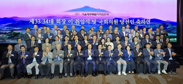 서울제주특별자치도민회는 24일 서울 영등포구 여의도동 글래드 호텔에서 서울제주도민회 회원들과 내외빈 등 300여명이 참석한 가운데 제33·34대 회장 이·취임식과 제22대 국회의원선거 당선인 축하연을 개최했다.