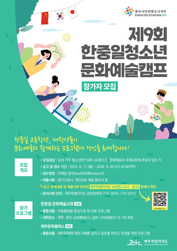 한중일 청소년문화예술캠프 참가를 희망하는 청소년은 제주도 홈페이지를 참고해 접수하면 된다.