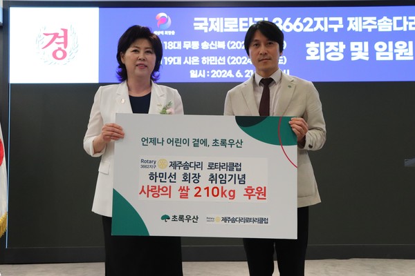 국제로타리 3662지구 제주솜다리로타리클럽(회장 하민선)은 최근 초록우산 제주지역본부(본부장 변정근)에 사랑의 쌀 210㎏을 기탁했다.