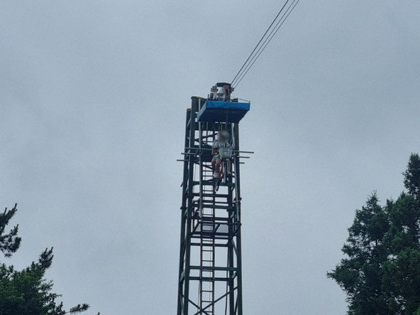제주의 한 관광체험장에서 11·9살 자매가 20m 높이 공중에 고립됐다가 50여분만에 구조됐다.