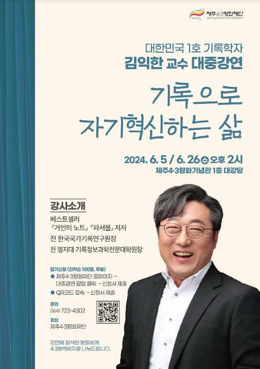 제주4·3평화재단은 오늘(26일) 오후 2시 제주4·3평화기념관 1층 대강당에서 '기록으로 자기혁신하는 삶'을 주제로 대중강연을 연다.
