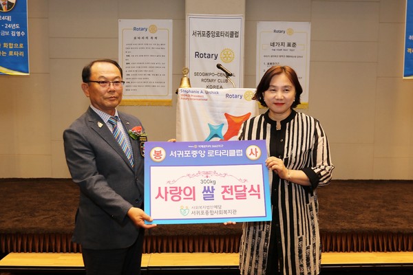 국제로타리 3662지구 서귀포중앙로타리클럽(신임회장 이성훈)은 지난 6월 22일 회장 및 임원, 이사 이취임식행사에서 받은 쌀300kg을 서귀포종합사회복지관에 전달했다. 이성훈 회장은 "초아의 봉사의 실천을 위해 지속적인 활동을 꾸준히 전개해 서귀포중앙로타리클럽의 자부심을 드높이겠다"고 밝혔다.