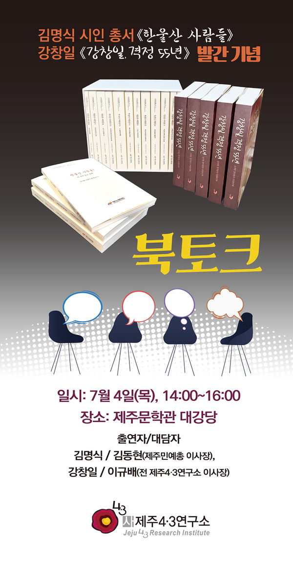 제주4·3연구소는 오늘(4일) 오후 2시 제주문학관 대강당에서 김명식 시인과 강창일 씨의 북토크를 개최한다.