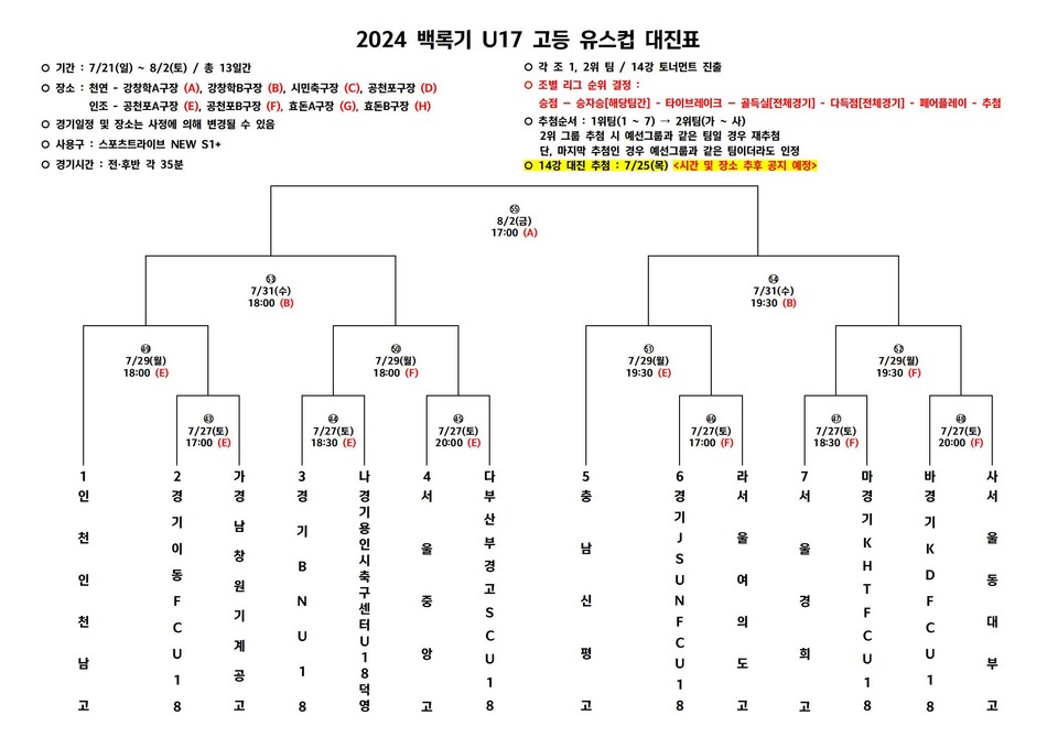 25일 예선 최종전 직후 진행한 대진 추첨을 통해 인천남고와 충남 신평고는 8강에 직행하는 행운을 거머쥐었다. 나머지 12개팀은 오는 27일 14강전을 치른다.