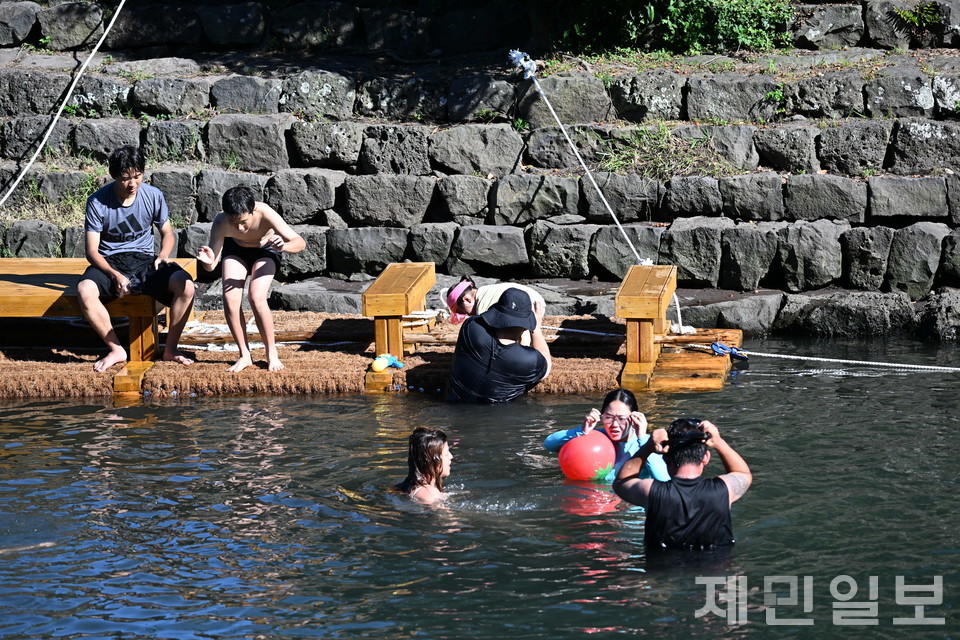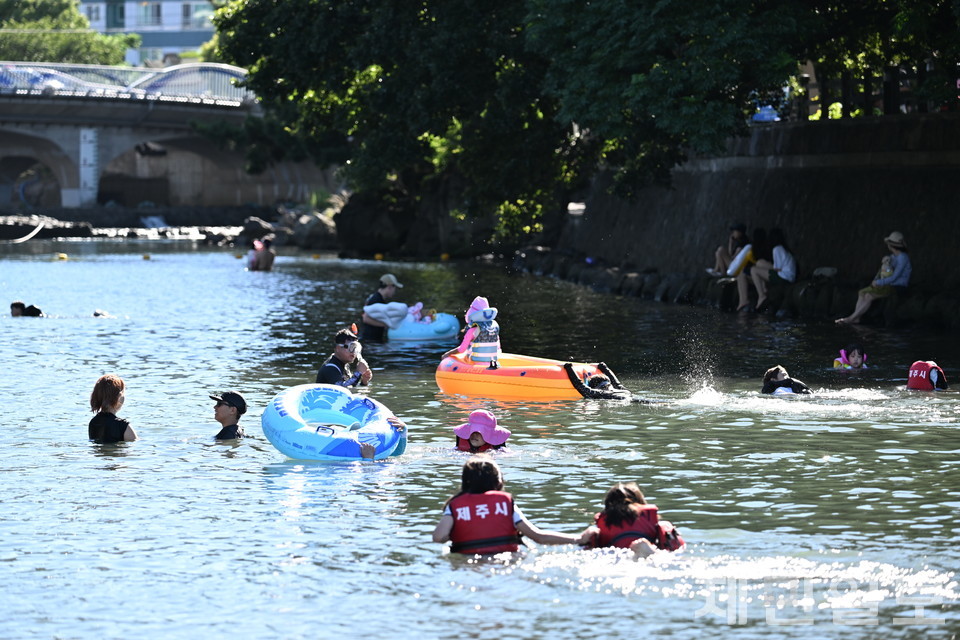 30일 제주시 서부지역에 폭염주의보가 발효된 가운데, 이날 오후 제주시 외도2동 일대를 흐르는 월대천에서 피서객들이 물놀이를 즐기고 있다. 월대천은 바다와 한라산 계곡물이 만나는 곳으로 사계절 시원하고 맑은물이 흘러 여름철 피서지로 유명하다. 김은수 기자