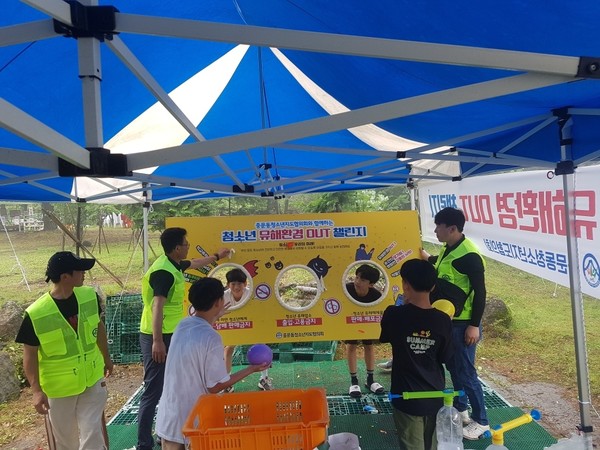 '청소년유해환경 OUT 챌린지'는 하원마을 쉼터 너른도의 숲속 야외 도서관에서 청소년 40여명이 참여해 ‘19세 미만 청소년 술·담배 판매금지’, ‘청소년 유해업소 출입·고용금지’,‘청소년 유해매체물 판매·배포금지’가 적힌 체험보드판에 청소년들이 물풍선을 던지는 체험프로그램을 실시했다.