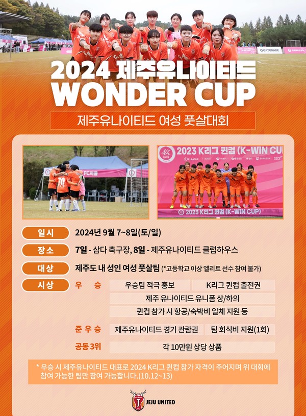 제주유나이티드는 오는 9월 7~8일 삼다축구장과 제주유나이티 클럽하우스에서 열리는 '원더컵' 참가팀을 선착순으로 모집한다.