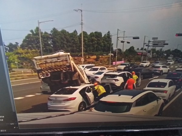 8일 제주소방안전본부에 따르면 이날 오후 12시5분께 제주시 조천읍 혹통교차로에서 승용차와 SUV, 1t트럭 등 차량 3대가 잇따라 부딪혔다는 신고가 접수됐다.