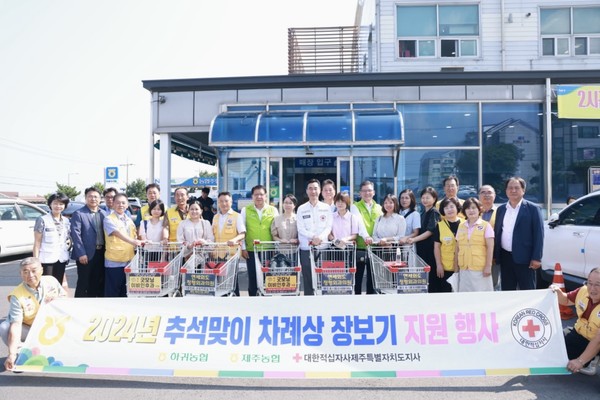 농협제주본부(본부장 윤재춘)와 대한적십자사 제주특별자치도지사(회장 정태근)는 9일 하귀농협 하나로마트에서 추석맞이 차례상 장보기 봉사활동을 펼쳤다.