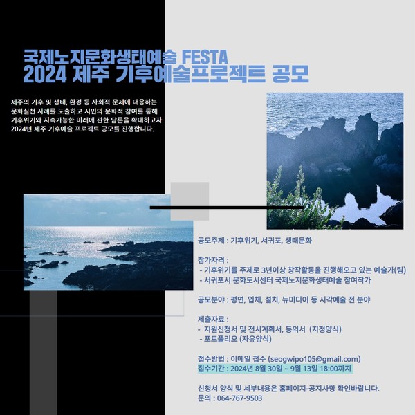 전시는 탄소 발생을 최소화하고, 서귀포의 환경과 역사, 지리적인 특성을 고려해 진행되며, 실현 방안과 대중성 확보를 위한 워크숍을 개최해 구체화할 예정이다. 공모는 9월 13일까지 이메일(seogwipo105@gmail.com)을 통해 접수하며 서귀포시문화도시센터 홈페이지(www.nojiculture.kr)에서 공고문과 제출서식 등 세부적인 내용을 확인할 수 있다. 관련 문의는 서귀포시문화도시센터(064-767-9502)로 하면 된다.